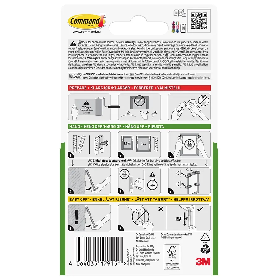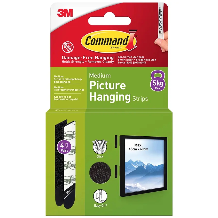 Strips til genplacering af Command kroge, ledningsholdere etc. Kan også bruges løse til ophængning af plakater mm. De 4 strips Kan bære en ramme, der vejer op til 5,0 kg. Egnet til de fleste glatte overflader, herunder malede vægge, fliser, metal og træ.