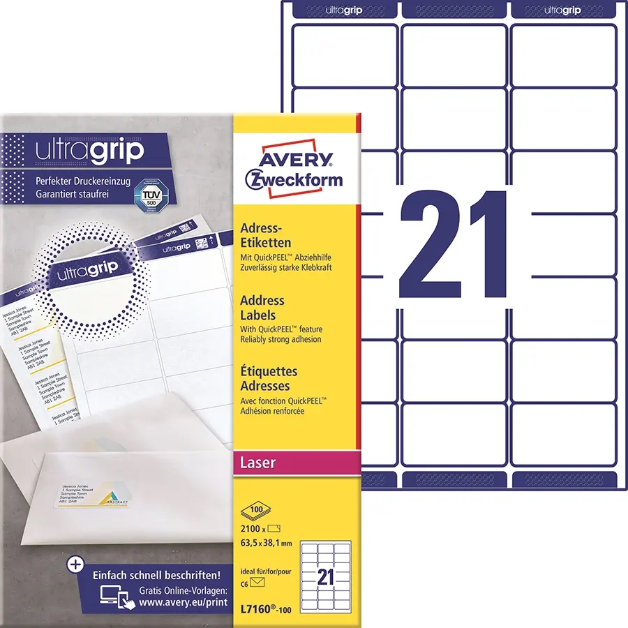 Avery L7160 QuickPeel Etiket 63,5 x 38,1 mm (21 pr. ark) Hvid 100 ark
