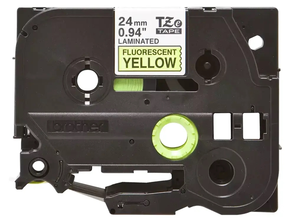 Brother TZe standard tape bruges til fremstilling af selvklæbende laminerede labels og er modstandsdygtige overfor vand, slid, kemikalier, sollys og ekstreme temperaturer. TZeC51 er 24 mm bred og med sort tekst på neon gul tape
