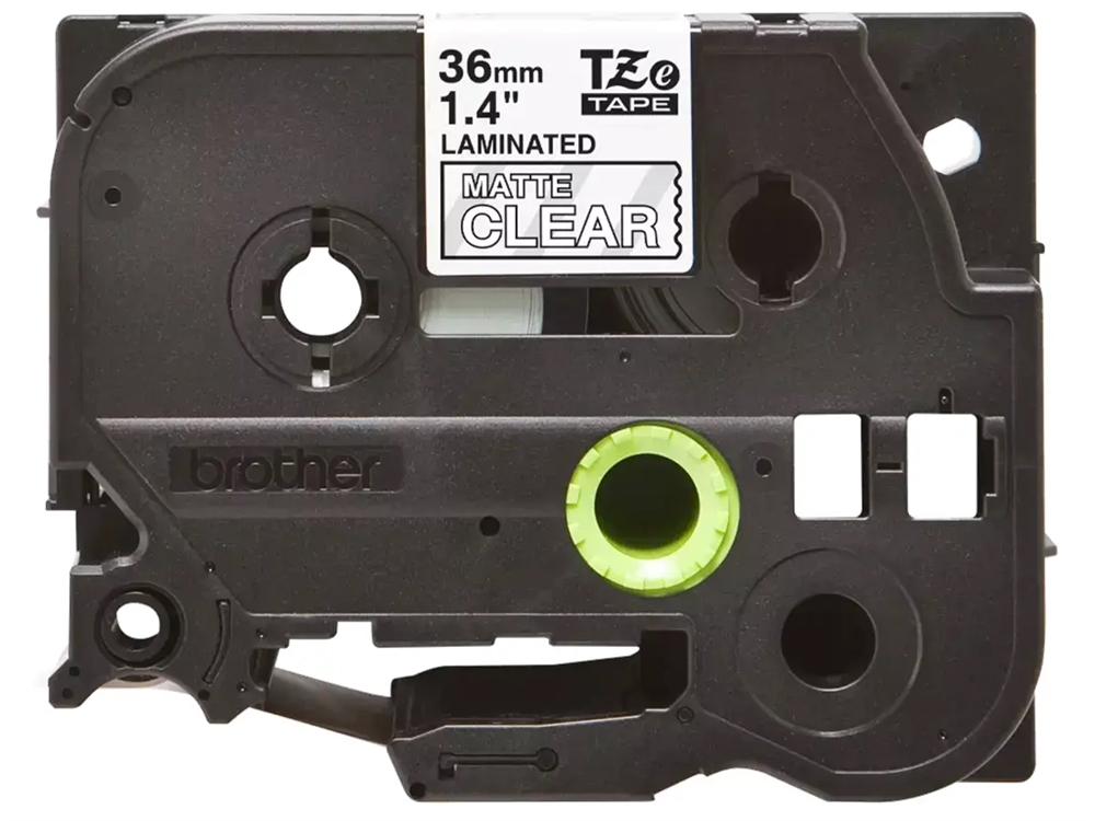Brother TZe mat tape har samme fysiske egenskaber som standard tapen. Den særlige matte overflade giver endvidere et eksklusivt udtryk og reducerer genskin. TZeM65 er 36 mm bred og med hvid tekst på klar mat tape