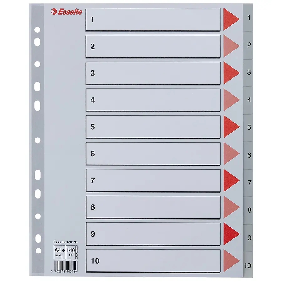 Kraftig PP-folie A4 Maxi med pile-design. Register i grå farver. Forblad med store skriveområder for indhold. 10 faner printet 1-10 og med 11 universalhuller til brug i alle standbard brevordnere og ringbind