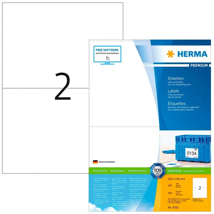 I alt 200 etiketter pr. æske. Etiketter i kraftig kvalitet og med permanent klæbende lim. Klæber hurtigt – også på kolde og fugtige overflader. Herma Premium etiketter kan benyttes i blæk- og laserprintere samt kopimaskiner. Word skabelon tilbydes.