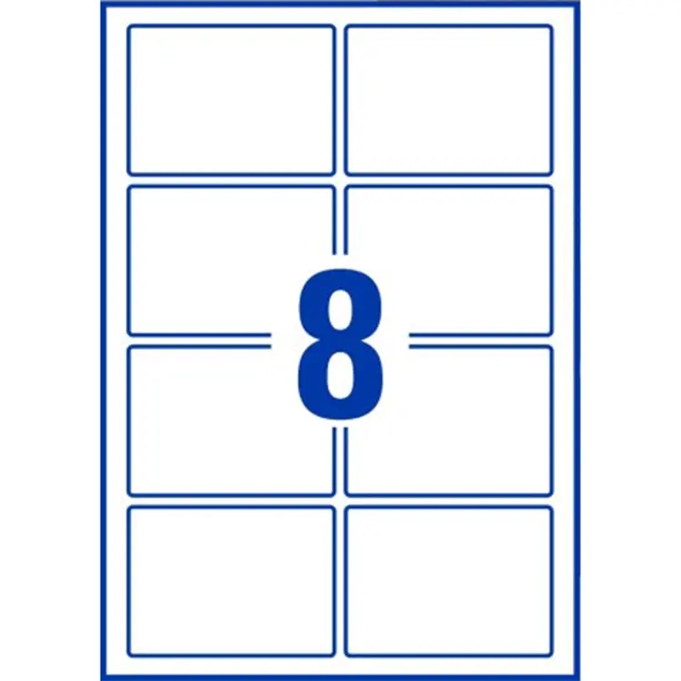 A4-ark med udstansede rektangulære etiketter i ekstra kraftig high gloss papirkvalitet (laserprint) og med permanent lim. I alt 400 etiketter pr. æske. Til denne vare tilbyder vi skabelon til Microsoft Word.