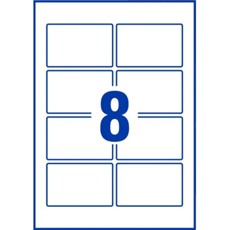 A4-ark med udstansede rektangulære etiketter i ekstra kraftig high gloss papirkvalitet (laserprint) og med permanent lim. I alt 400 etiketter pr. æske. Til denne vare tilbyder vi skabelon til Microsoft Word.