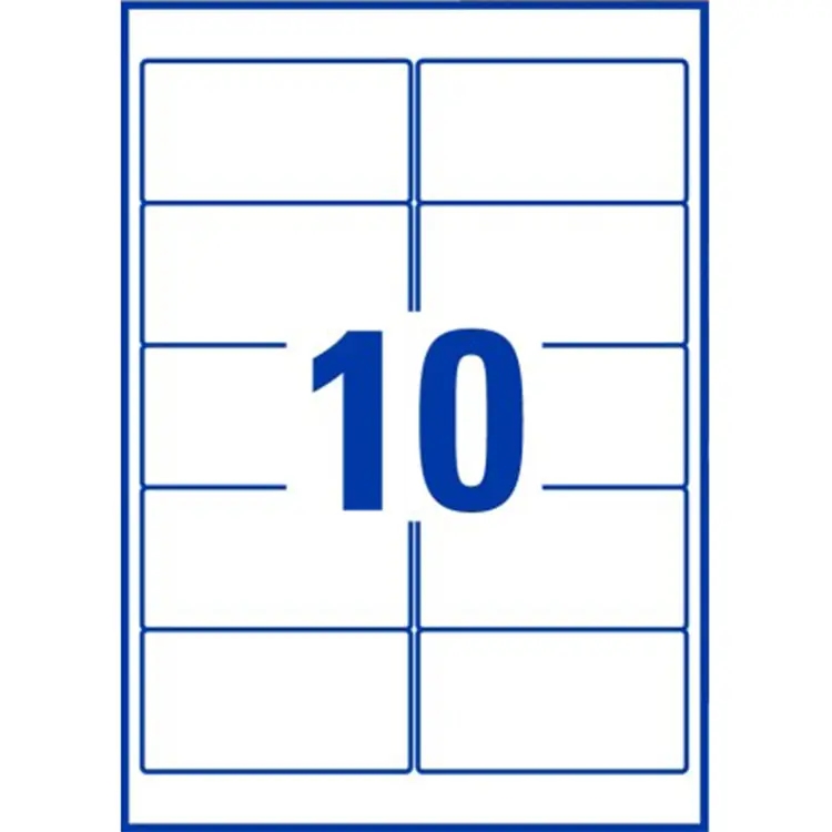 A4-ark med udstansede rektangulære etiketter i ekstra kraftig high gloss papirkvalitet (inkjet print) og med permanent lim. I alt 500 etiketter pr. æske. Til denne vare tilbyder vi skabelon til Microsoft Word.