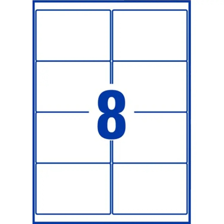 A4-ark med udstansede rektangulære etiketter i ekstra kraftig high gloss papirkvalitet (inkjet print) og med permanent lim. I alt 400 etiketter pr. æske. Til denne vare tilbyder vi skabelon til Microsoft Word.