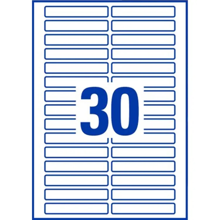 A4-ark med udstansede rektangulære etiketter i ekstra kraftig papirkvalitet og med permanent klæbende lim. I alt 6000 etiketter pr. æske. Til denne vare tilbyder vi skabelon til Microsoft Word.