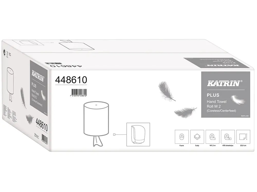 Katrin 448610 er en ekstra blød og kraftig håndklæderulle i højeste kvalitet. Papiret er svanemærket 2-lags naturligt hvid og er velegnet til brug i det offentlige rum og er godkendt til kortvarig kontakt med fødevarer. Til M-dispenser. 6 ruller.