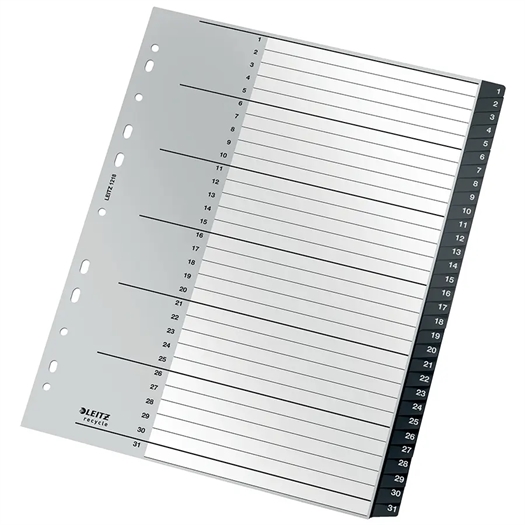 Ekstra bredt A4-register i premium kvalitet. Indeholder 31 ark 1-31 alfabetiske faneblade. 90% (præ-consumer) recirkuleret plast og 100% recirkulerbart