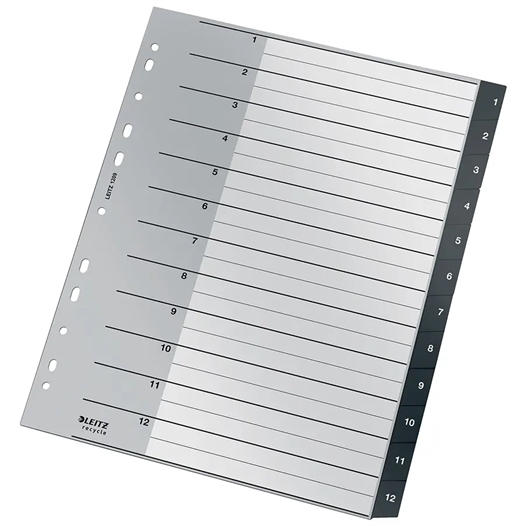 Ekstra bredt A4-register i premium kvalitet. Indeholder 12 ark 1-12 alfabetiske faneblade. 90% (præ-consumer) recirkuleret plast og 100% recirkulerbart