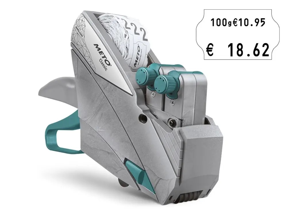 Den 2-linjers håndholdte prispistol Classic L 1932 fra METO er en klassisk prispistol, som har lang levetid og høj driftssikkerhed. Den skriver max 12+7 tegn på 32 x 19 mm etiketter. Indeholder flere valutasymboler – bl. Kr. og Euro.