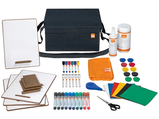 Bæretaske med whiteboardtilbehør: whiteboardmarkere, whiteboard magneter, magnetiske skriveplader, selvklæbende gittertape, renseservietter, whiteboardrense, mikrofiberklud, saks, miniwhiteboards i A4 og mini whiteboardmarkere i assorterede farver.
