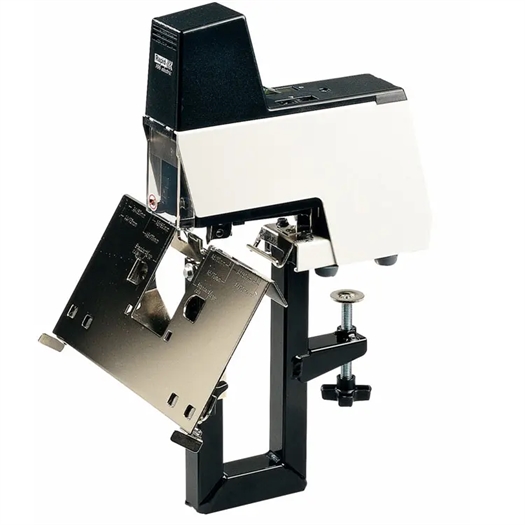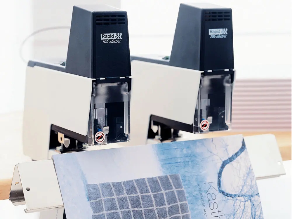 Skaffevare: leveres normalt inden for 10-12 dage. Som model 105E men med et arbejdsbord til begge standarder og sadelhæftning (til brochurer og foldere).