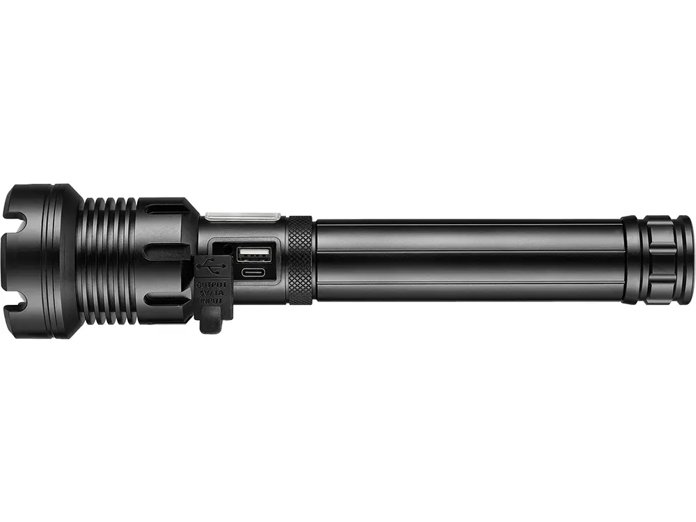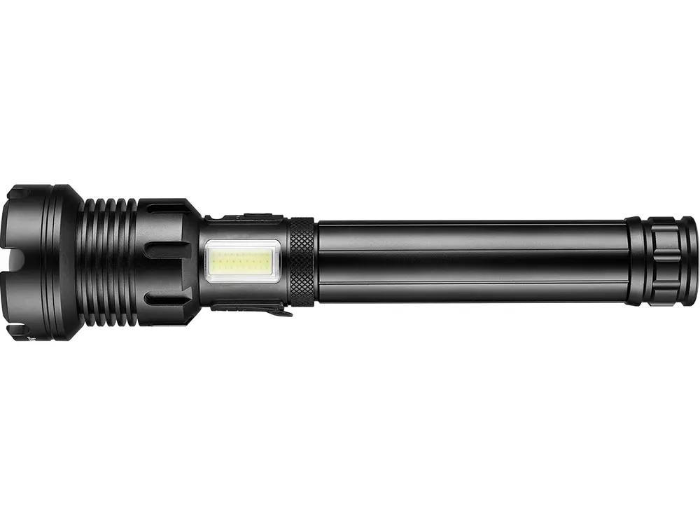 Her får du en kraftig powerbank, pakket ind i en LED lygte med flere lysstyrker, zoom linse, lanterne på siden med flere funktioner og mulighed for rødt lys. Integreret USB stik til opladning af smartphone. Kan bruges som nødhammer via kransen i toppen
