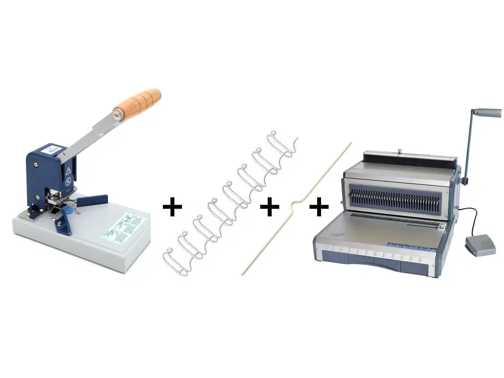 Startsæt med materialer og udstyr til fremstilling af professionelle kalendere. Pakken indeholder ekstra kraftig elektrisk indbindingsmaskine, som stanser op til 25 ark 80 grams papir ad gangen.