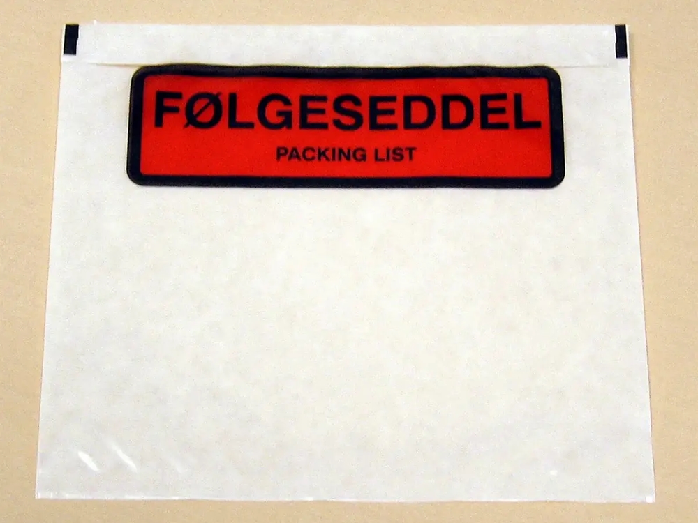 Selvklæbende dokumentlommer – følgeseddellommer – til fakturaer, følgesedler og andre forsendelsespapir. Lommerne er fremstillet af miljøvenlig genbrugsplast. De angivne mål er udvendige mål.