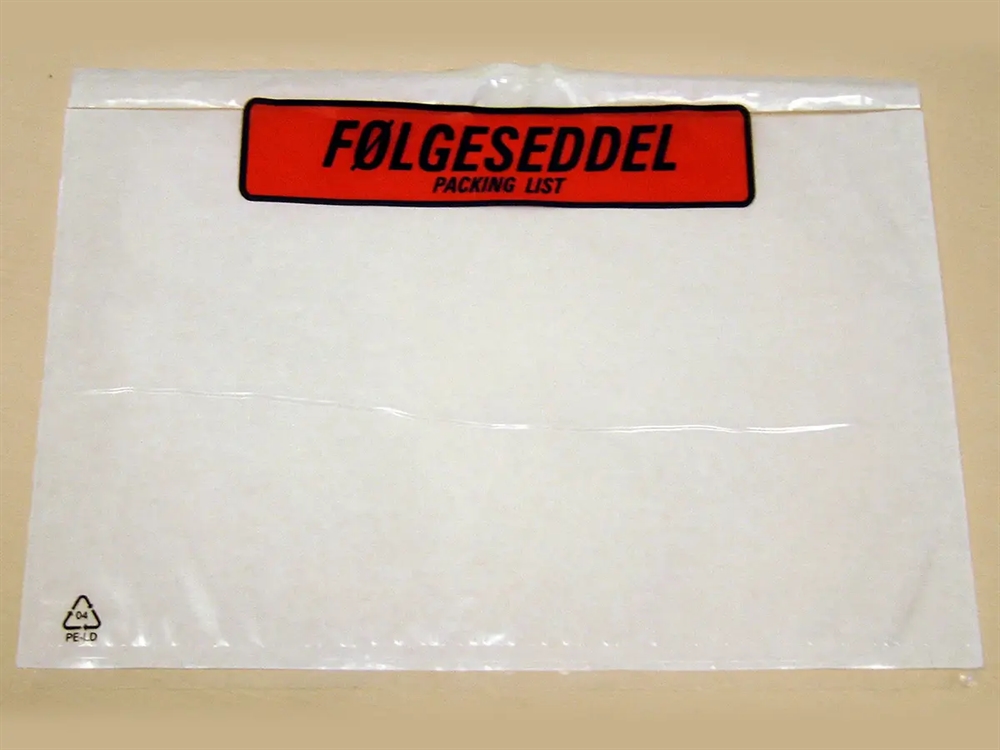 Selvklæbende dokumentlommer – følgeseddellommer – til fakturaer, følgesedler og andre forsendelsespapir. Lommerne er fremstillet af miljøvenlig genbrugsplast. De angivne mål er udvendige mål.