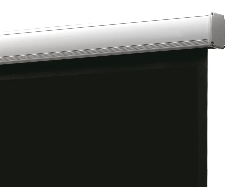 Flot projektor lærred til mødelokale eller hjemmebiograf. Pro version med bl.a. langsom automatisk oprulning. Kan monteres på væg, i loft eller hængende i kæde eller wire. Med 50 cm sort "drop down" i toppen af lærredet.